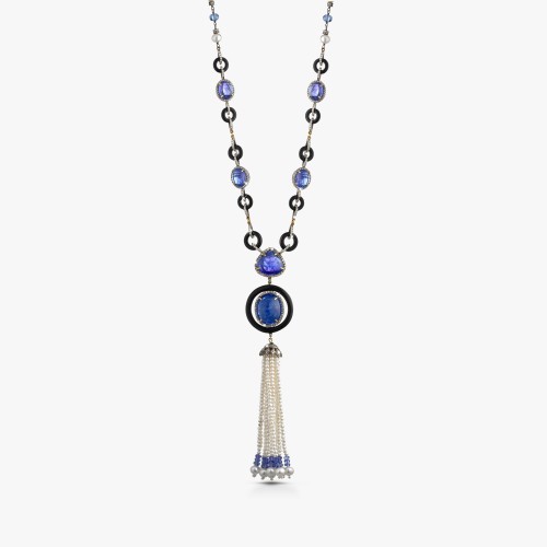 Bracciale in oro bianco con zaffiri Ceylon incisi e diamanti taglio brillante.