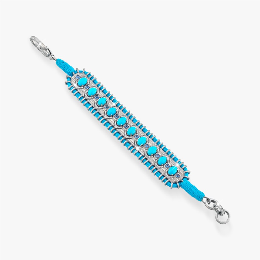 Un bracciale dal design all'avanguardia, sapientemente incastonati brillanti e zaffiri, trovano posto in una raffinata composizione di tessuto colorato e argento brunito 925, unendo innovazione, colore e vitalità.
