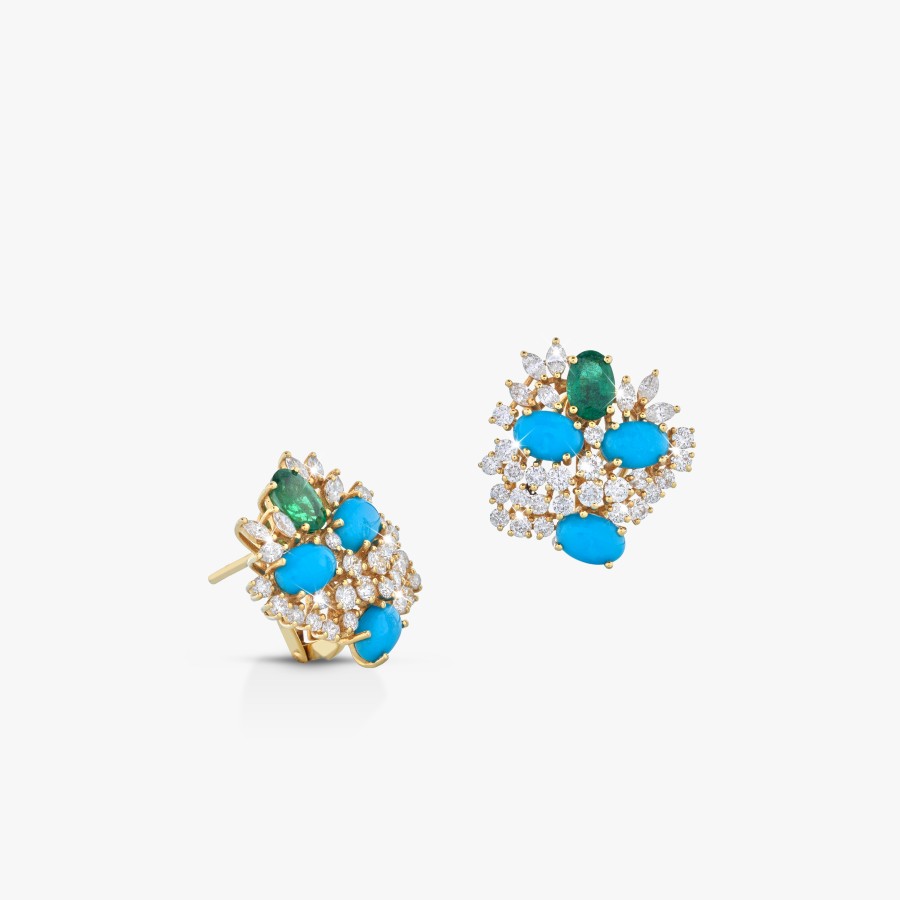 Irradiando un irresistibile eleganza dal fascino senza tempo, i magnifici Orecchini Dionysus in oro 18 kt giallo sono adornati da uno scintillante pavé di diamanti taglio fantasia, da uno splendido smeraldo e turchese. Un perfetto connubio tra la più alta maestria artigianale e un confort d'eccezione.