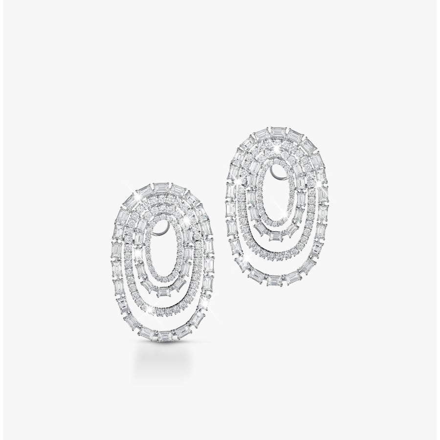 Una perfetta convergenza tra volume e brillantezza. Preziosi diamanti taglio fantasia si avvolgono in un sofisticato labirinto di oro 18 kt bianco formando un connubio perfetto fra struttura e movimento.