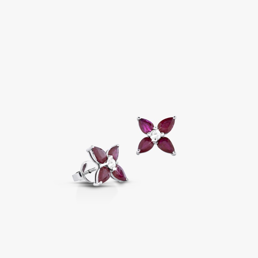 Grazie alla meravigliosa forma di questi preziosi orecchini in oro 18 kt bianco i rubini affermano la loro straordinaria intensità col diamante centrale taglio brillante.